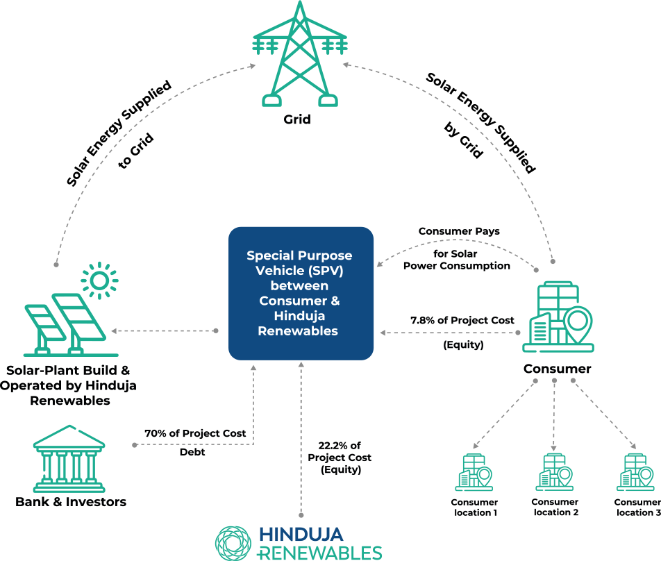Electricity generated is injected into the state grid and wheeled to each consumer location using open access mechanisms.